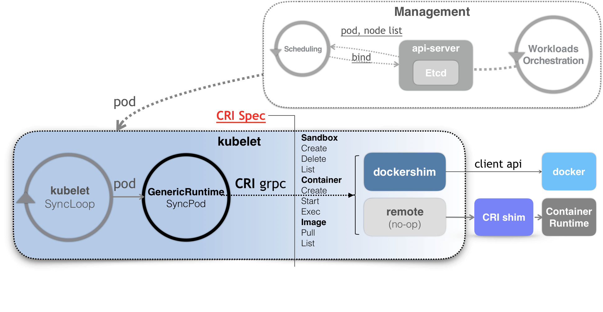 kubelet 会监听 pod 对象的变化,根据变化并调用 CRI 来创建或者更新容器。CRI 由不同的容器技术实现,对 kubelet 暴露出 gRPC 服务